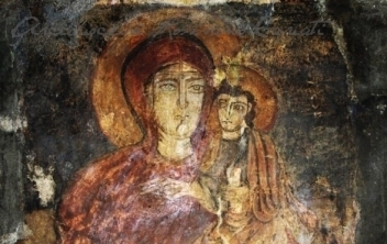 L’immagine, che rappresenta una vergine con il bambino, è di stile bizantino ed è datata tra il VI e l’VIII secolo, a seconda delle interpretazioni. Sul lato destro dell’immagine, verticalmente, si può leggere, in lettere greche, la parola ‘Theotokos’, madre di Dio. Si tratta di una vergine intera che regge nel braccio sinistro il bambino che ha la mano destra verso la madre con gesto di benedizione e nella sinistra sostiene un rotolo. La vergine indossa un mantello rosso oscuro che le copre anche il capo.